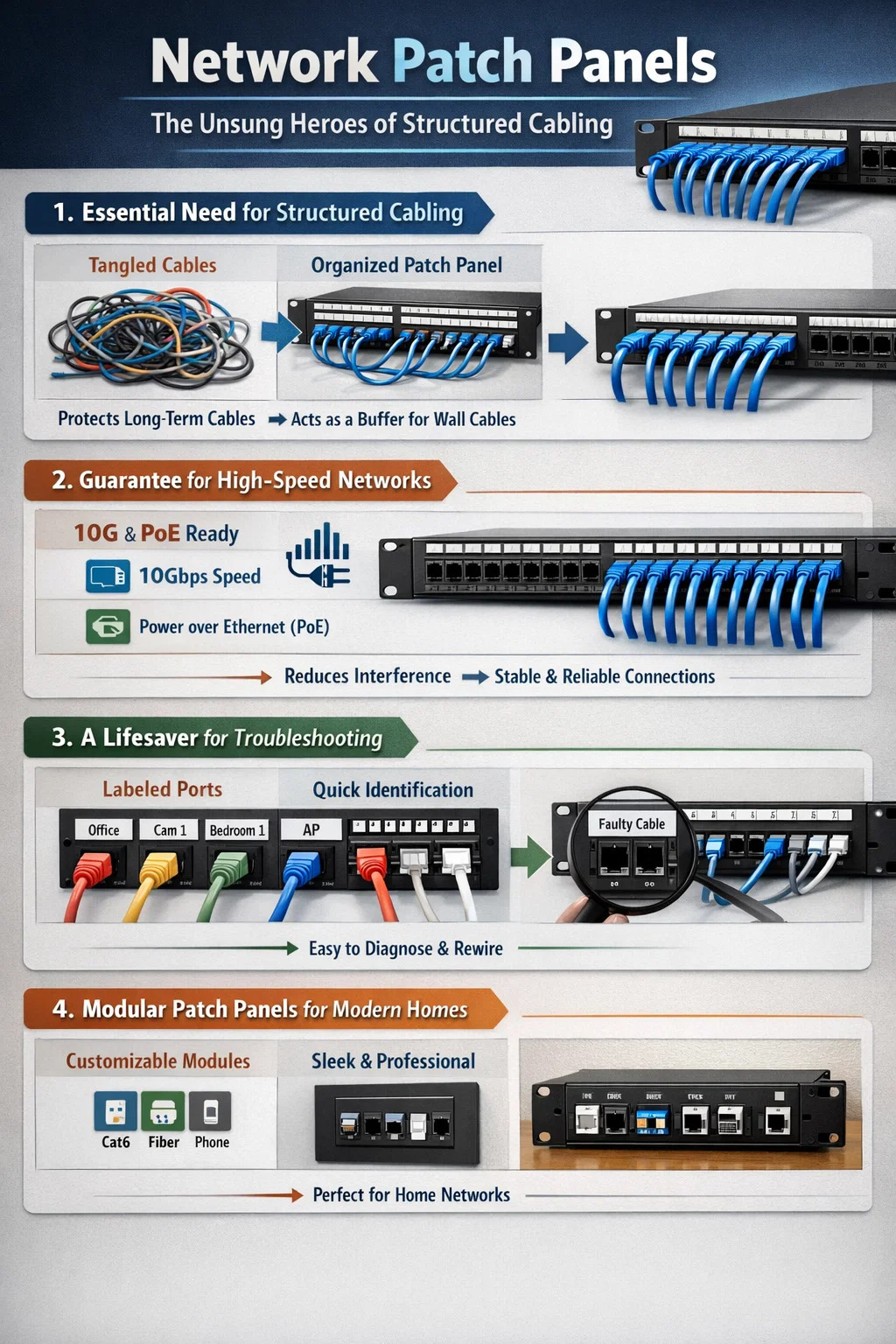 Estética mejorada: en comparación con una caja de bajo voltaje repleta de conectores RJ45 y cables desordenados, un panel modular ordenado hace que la casa luzca muy profesional.