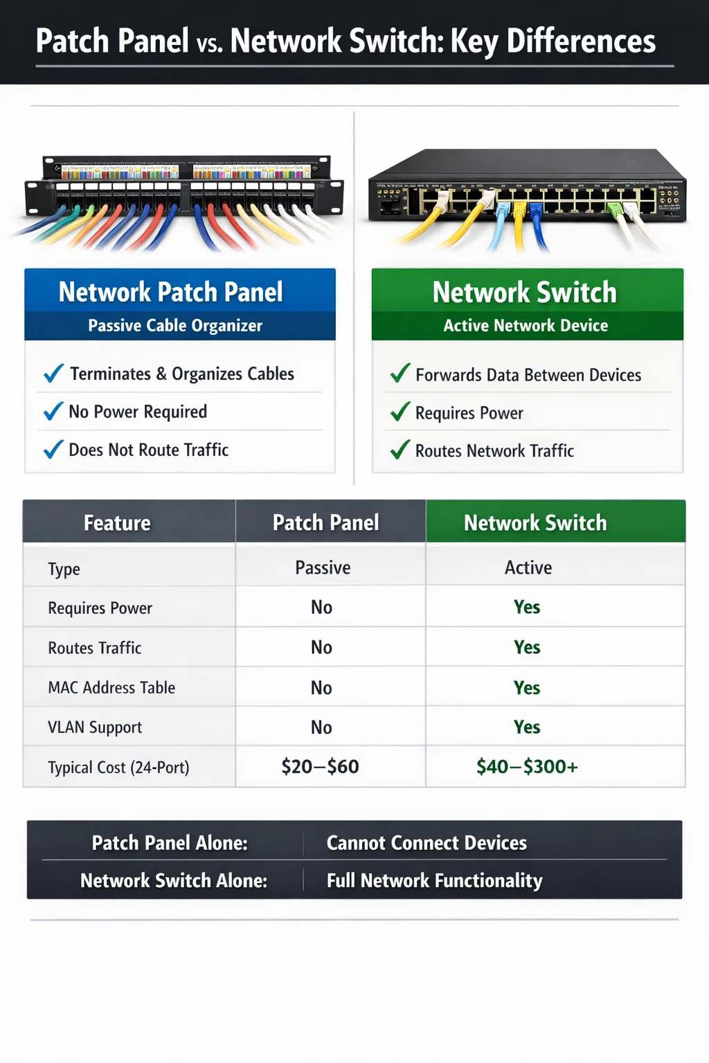 Observe la última fila: un conmutador puede funcionar sin un panel de conexiones, pero un panel de conexiones no puede proporcionar ninguna función de red sin un conmutador. Esto confirma que si tienes que elegir solo uno, el interruptor es el dispositivo no negociable.