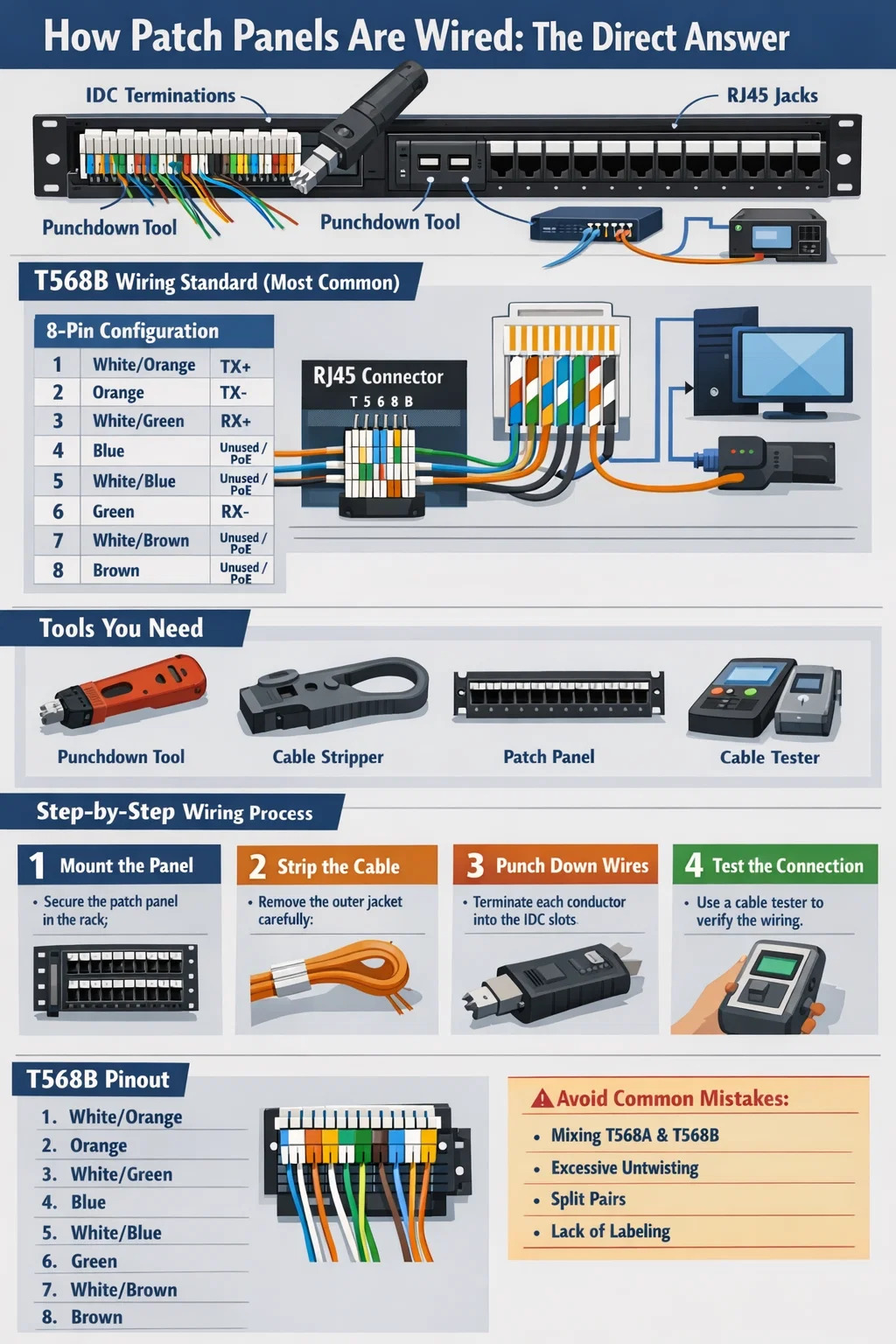 un properly wired and documented network patch panel is the foundation of a manageable, reliable network infrastructure. The discipline applied during initial installation — correct wiring standard, proper untwist limits, firm punchdowns, thorough testing, and complete labeling — pays forward every time a network change is needed or a fault must be traced. Cutting corners during termination creates debt that the network team will be paying off for the life of the installation.