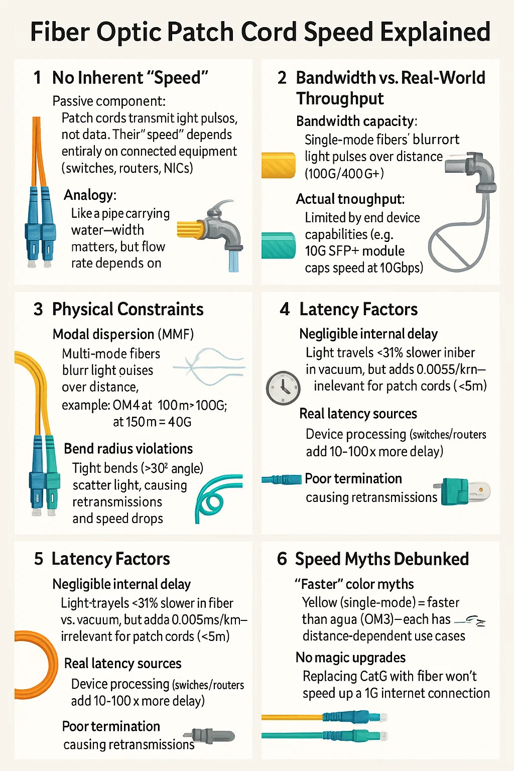Retraso interno insignificante: la luz viaja ~ 31% más lento en fibra frente al vacío, pero agrega 0.005ms/km, irrelevantes para cables de parche (<5m).