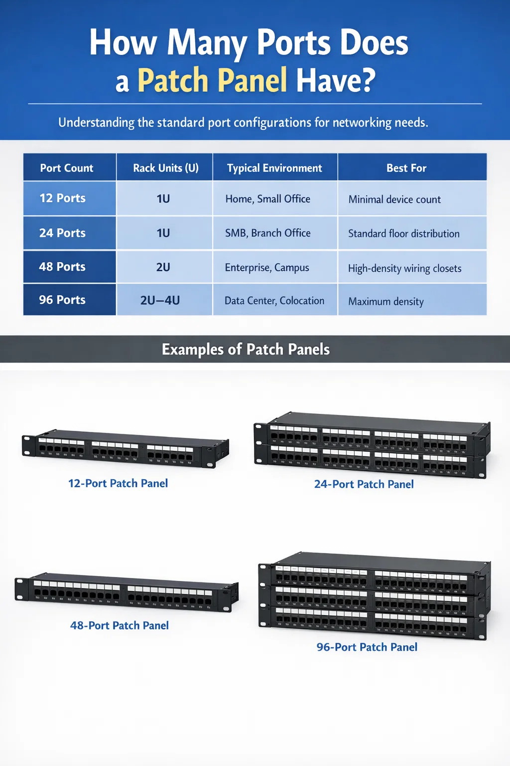 un panel de conexión de red normalmente viene en 12, 24, 48 o 96 puertos , siendo los modelos de 24 y 48 puertos los más implementados en entornos comerciales y empresariales. El panel de conexión de 24 puertos encaja en 1U de espacio en rack , mientras que la versión de 48 puertos ocupa 2U . Los paneles más pequeños de 12 puertos son comunes en configuraciones domésticas o armarios de telecomunicaciones compactos, y los paneles de 96 puertos de alta densidad se encuentran en grandes centros de datos donde el espacio en rack es escaso.