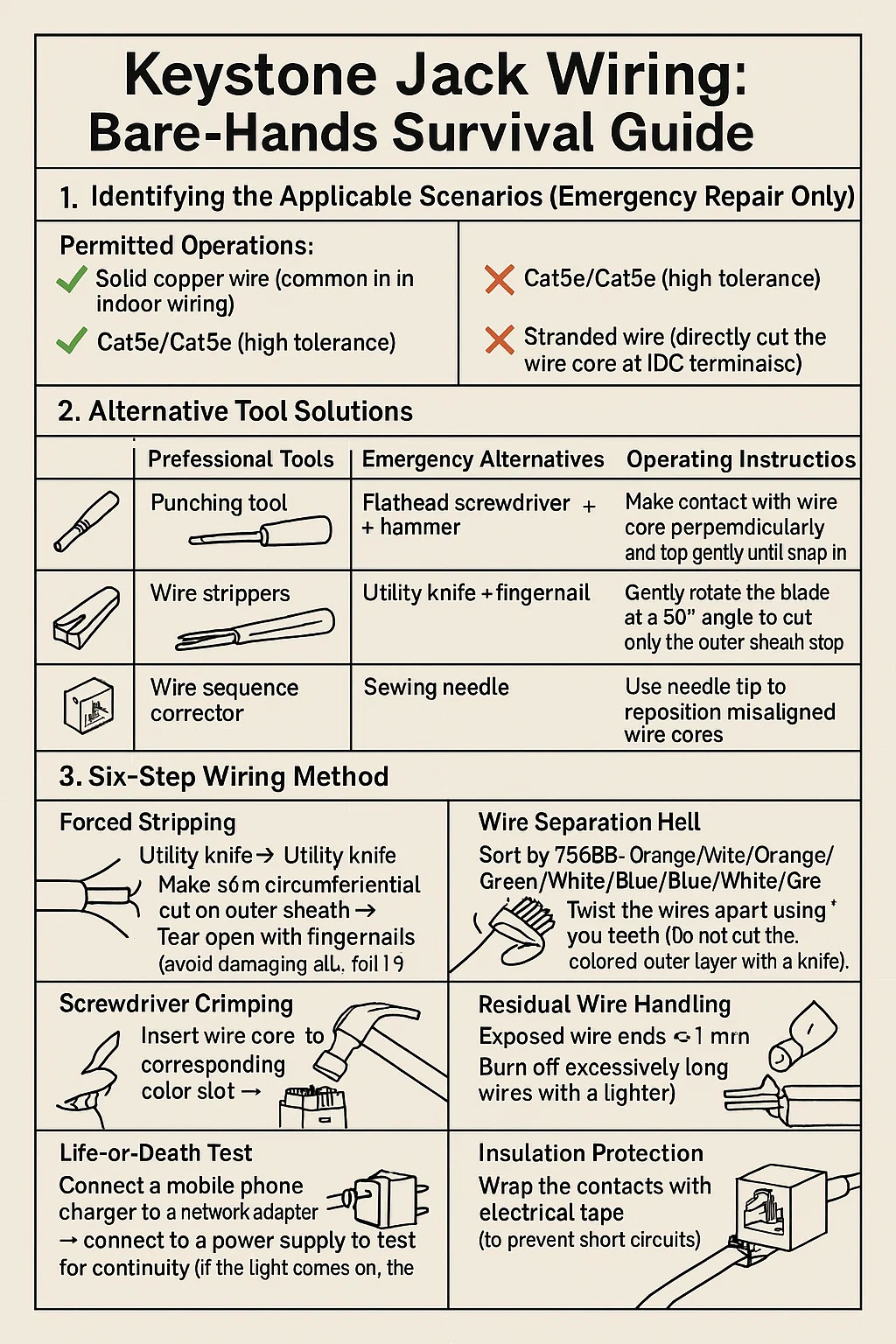 • Infierno de separación de cables: Ordenar por T568B: Naranja/Blanco/Naranja/Verde/Blanco/Azul/Azul/Blanco/Verde/Marrón/Blanco/Marrón. Separe los cables con los dientes (¡no corte la capa exterior de color con un cuchillo!).