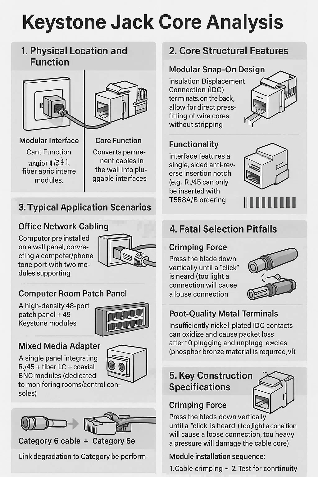 Cableado de red de oficina: Keystone preinstalado en un panel de pared, conectando una computadora/teléfono (un puerto con dos módulos que admiten datos y voz). Panel de conexiones de la sala de computadoras: Un panel de conexiones de 48 puertos de alta densidad = 48 módulos Keystone (más fácil de mantener que un modelo todo en uno).