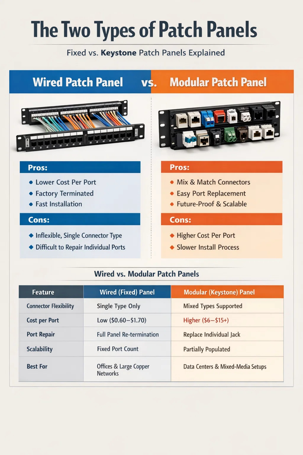 Un panel de conexión cableado viene con cables ya terminados en la parte posterior del panel en fábrica. Un panel de conexión modular, por otro lado, se envía como un marco vacío que acepta conectores Keystone intercambiables, lo que permite al instalador elegir tipos de conectores, categorías e incluso mezclar tipos de medios dentro de un solo panel. Ambos cumplen la misma función principal (organizar y enrutar conexiones de red), pero lo hacen de maneras fundamentalmente diferentes y se adaptan a diferentes escenarios de implementación.