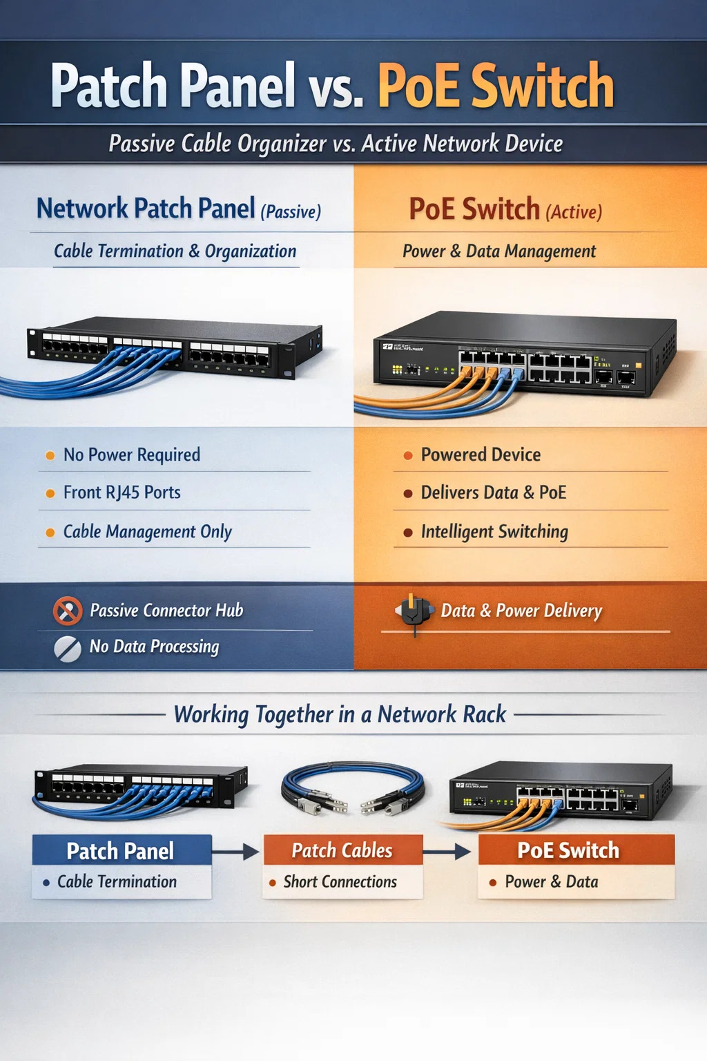 Si se pregunta cuál necesita, la respuesta suele ser "ambos" para cualquier cosa que no sea una configuración de hogar pequeña. Un conmutador PoE proporciona la potencia y la lógica, pero sin un panel de conexión de red , su instalación carecerá de la estabilidad física y la organización necesarias para el mantenimiento y la confiabilidad a largo plazo.
