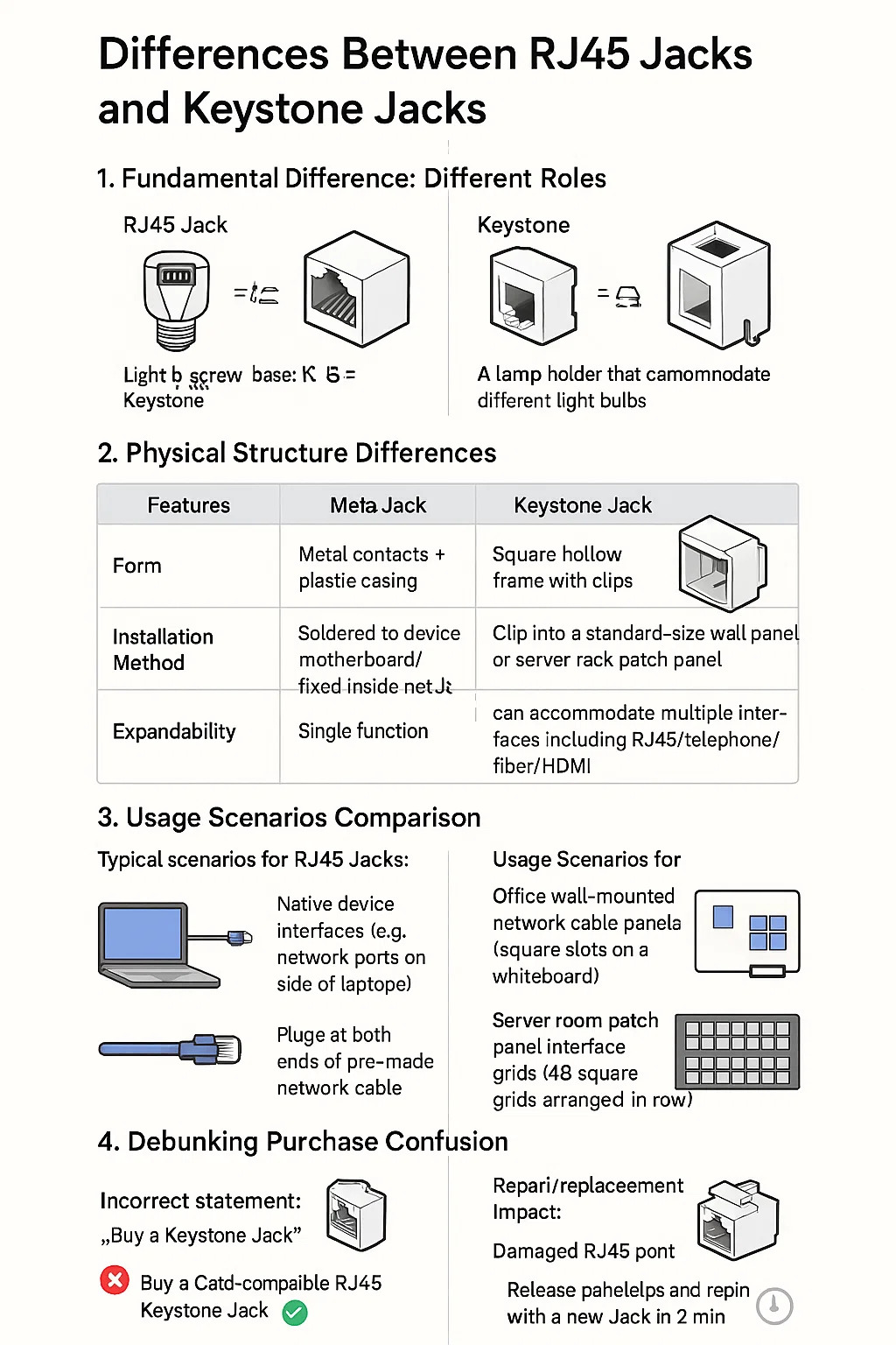 Analogía: RJ45 = la base roscada de una bombilla; Keystone = un portalámparas que puede alojar diferentes bombillas.