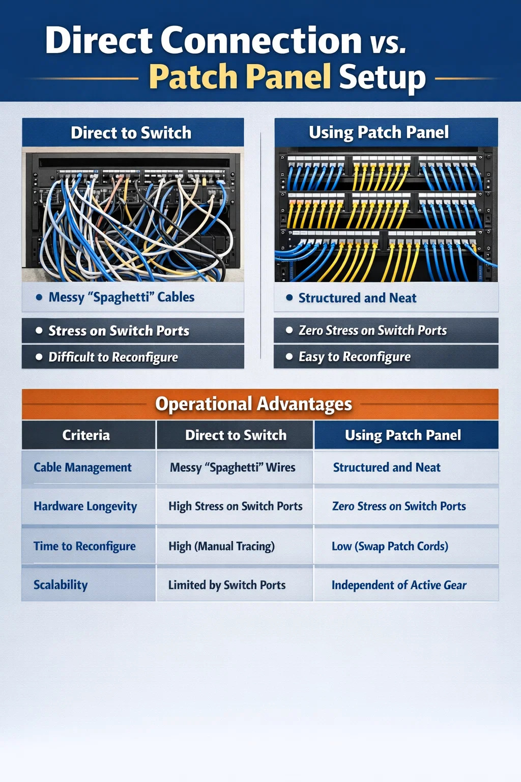 La tecnología de redes evoluciona rápidamente. Hoy en día, es posible que esté utilizando un conmutador de 1 Gbps, pero dentro de tres años, es posible que desee actualizar a un conmutador PoE de 10 Gbps para puntos de acceso Wi-Fi 7 de alta gama. Si sus cables están conectados directamente al interruptor anterior, la actualización implica desconectar todo y correr el riesgo de dañar el cable.